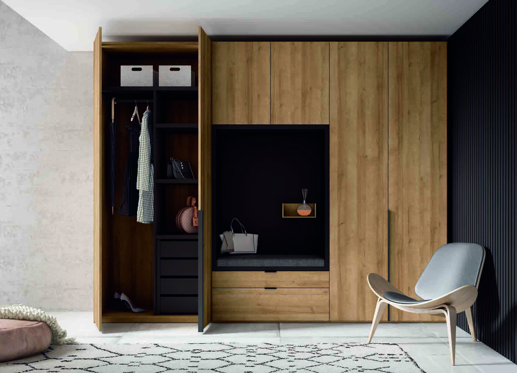 El armario Eternal destaca por su diseño actual y acogedor, con acabados en madera natural que aportan calidez y elegancia a cualquier dormitorio o vestidor. Su composición modular te permite aprovechar el espacio al máximo, adaptándose a tus medidas y necesidades reales.