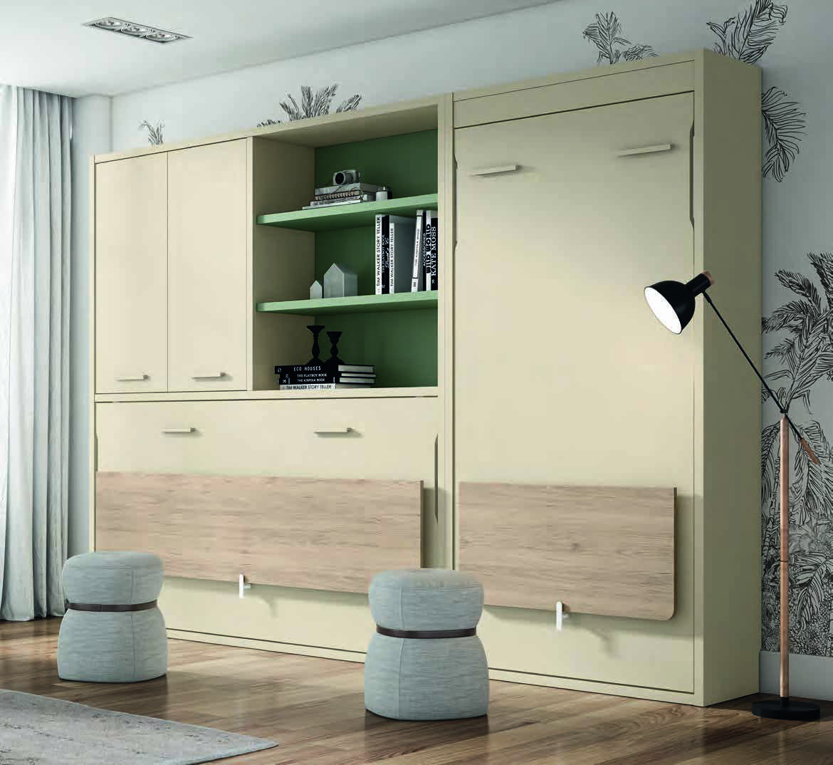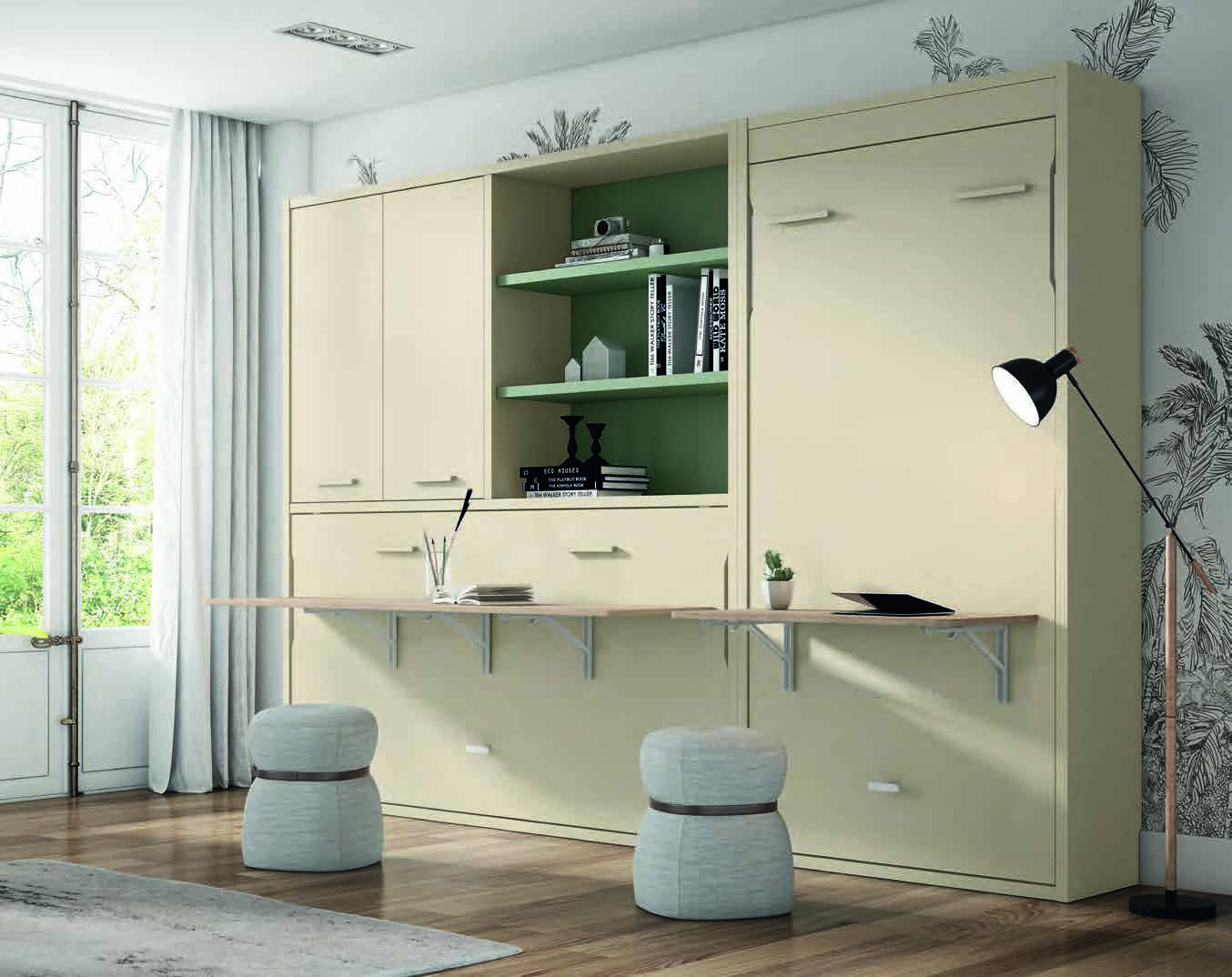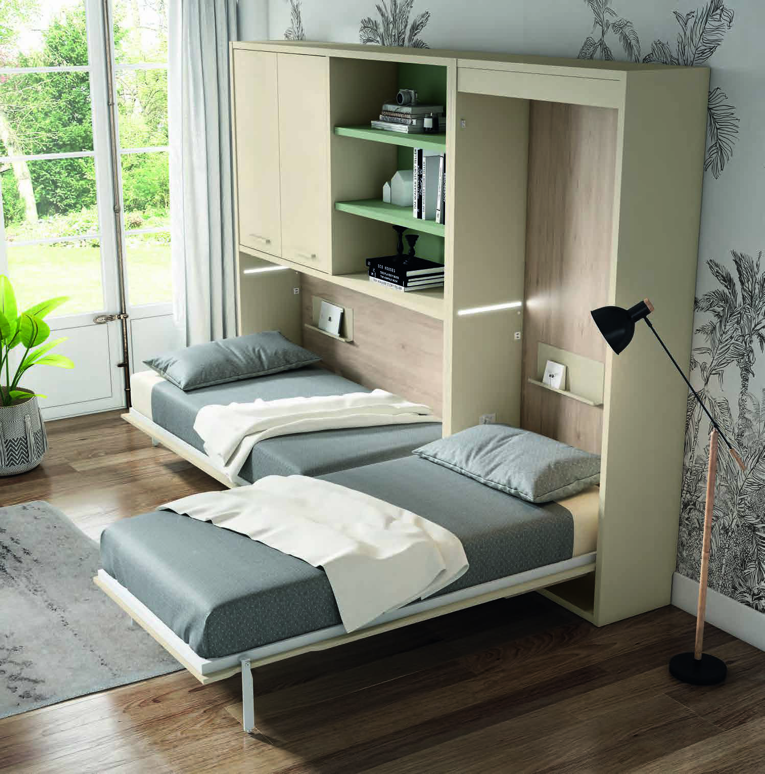 Este dormitorio juvenil doble combina dos camas abatibles individuales, zona de estudio abatible y espacio de almacenaje, todo en una misma composición elegante y funcional.