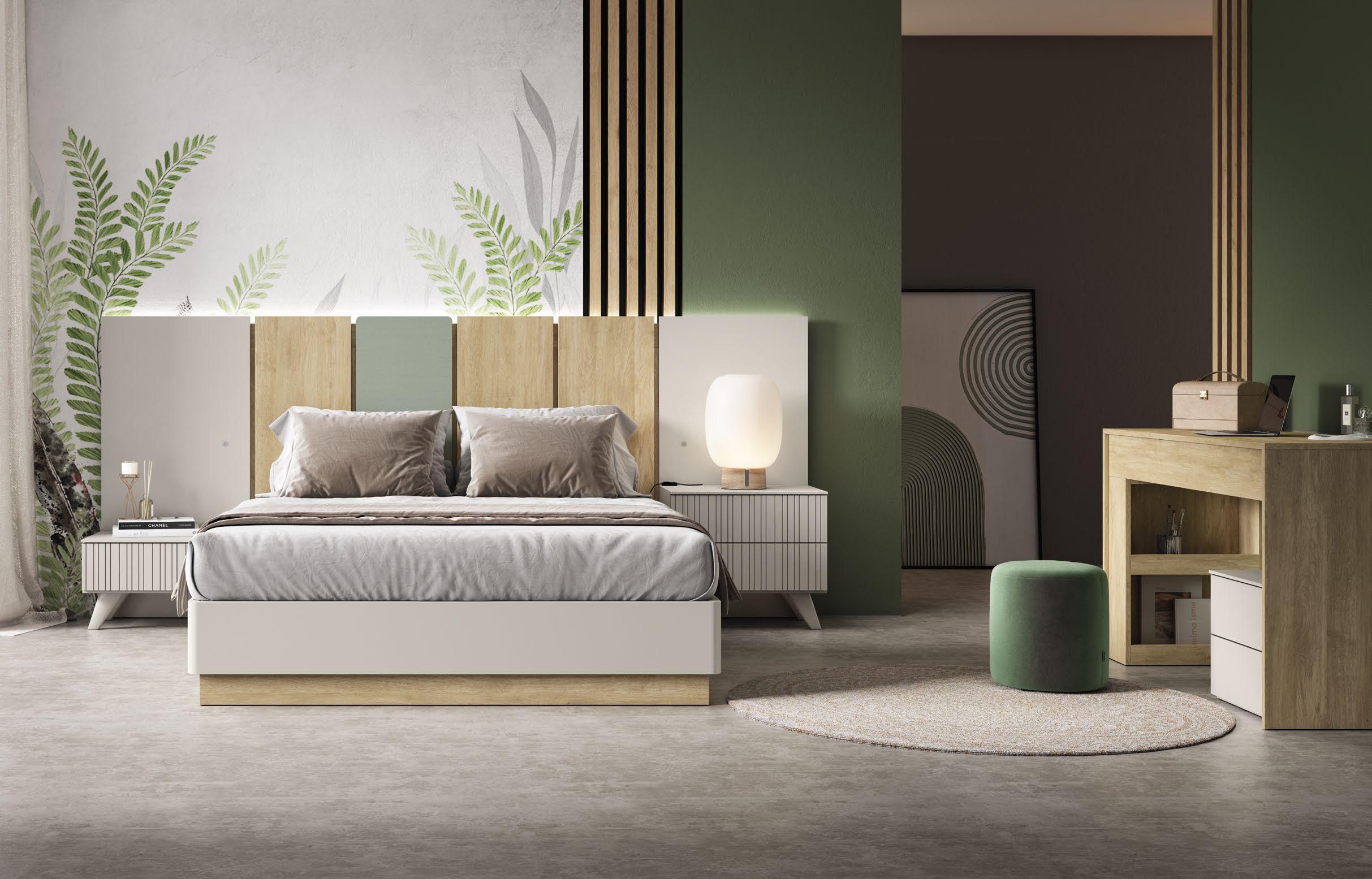 Este dormitorio combina diseño, calidez y funcionalidad en una propuesta moderna y serena. Los tonos madera clara, blanco y verde se funden para crear un ambiente acogedor y relajante, perfecto para disfrutar de un descanso reparador.