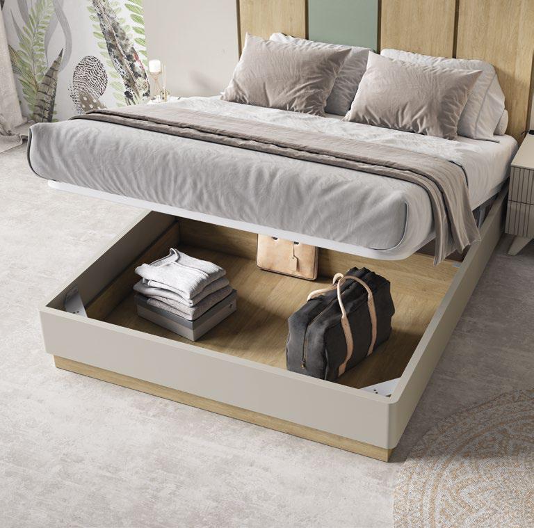 La cama cuenta con un canapé abatible con gran capacidad de almacenaje, ideal para aprovechar al máximo cada espacio. El cabecero con iluminación y paneles combinados añade carácter y estilo, mientras que las mesitas con detalles acanalados completan el conjunto con un toque de diseño contemporáneo.