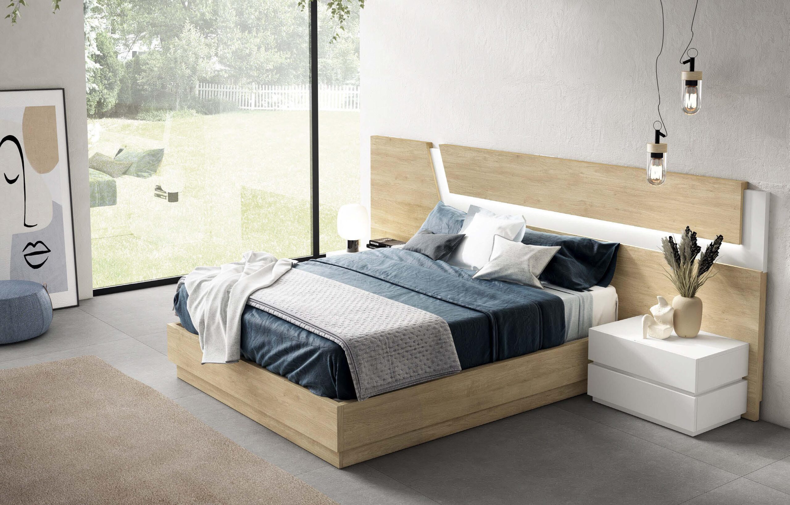 Este dormitorio de matrimonio combina acabado en madera clara y blanco para crear un ambiente cálido, luminoso y muy actual. Su cabecero con iluminación integrada y su cama con canapé abatible aportan un plus de confort y almacenaje sin renunciar a la elegancia.