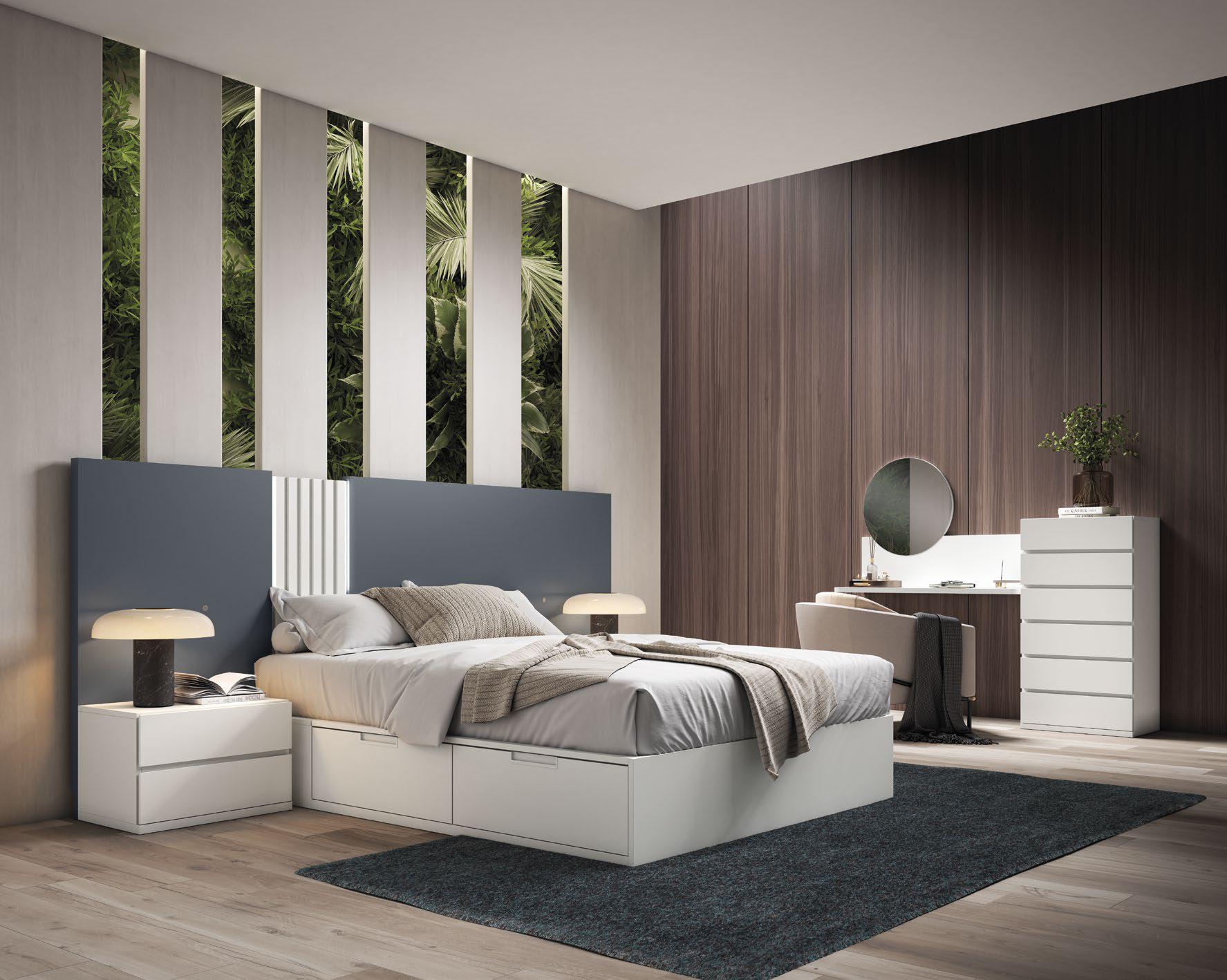El cabecero con paneles decorativos y detalle central estriado aporta textura y estilo, mientras que la cama con cajoneras integradas ofrece una solución práctica de almacenaje sin perder armonía visual.