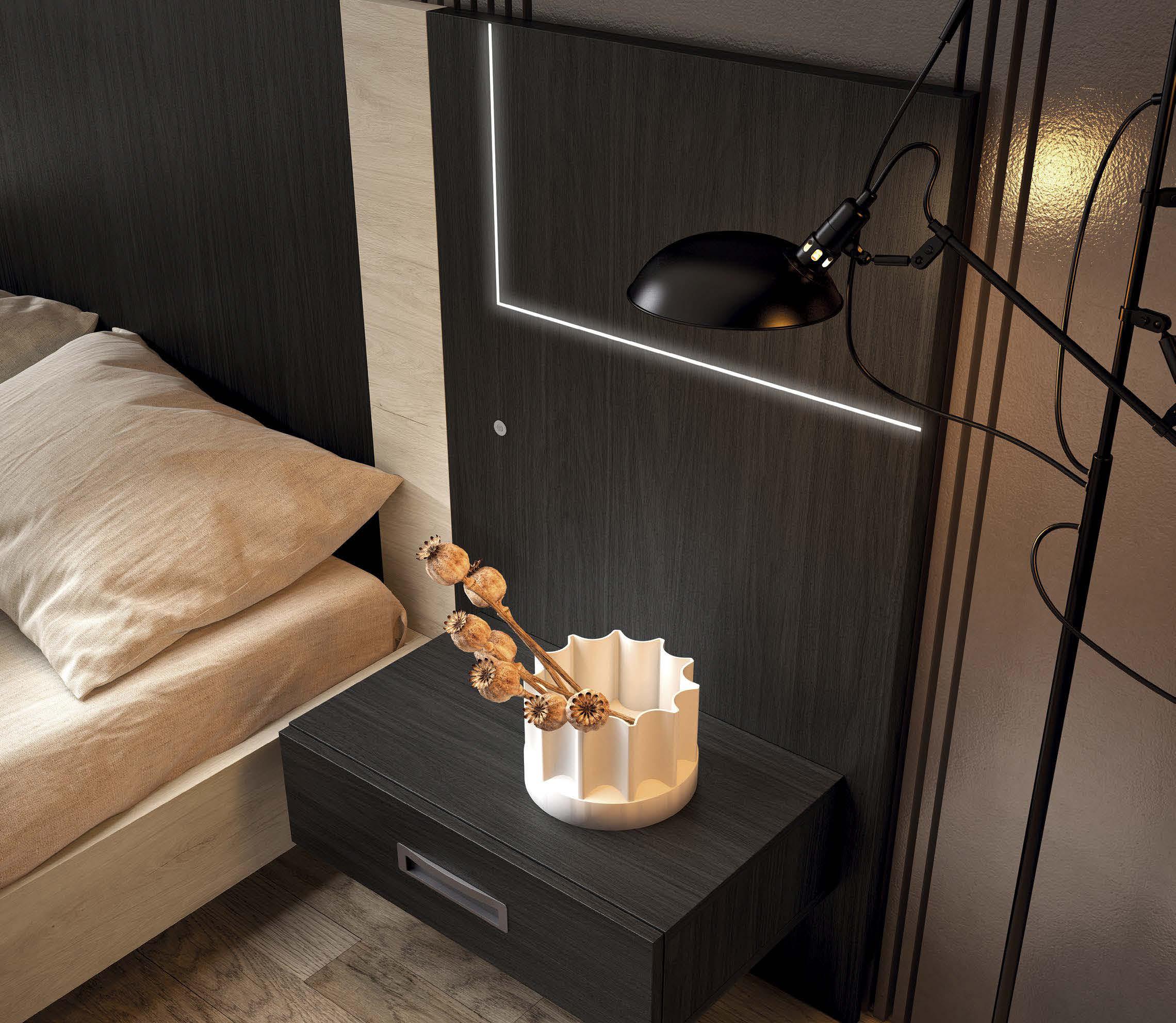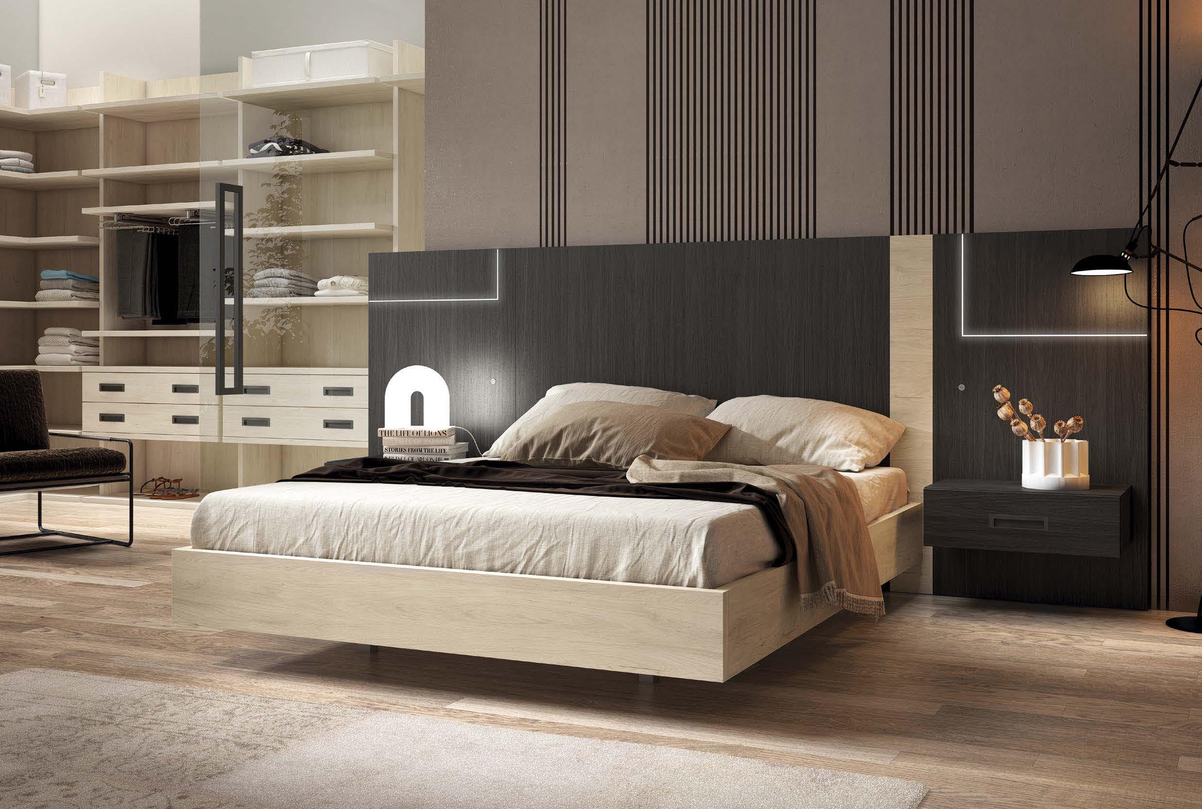 El cabecero con iluminación LED integrada aporta un toque funcional y acogedor, mientras las mesitas suspendidas refuerzan esa sensación de ligereza y diseño limpio.
