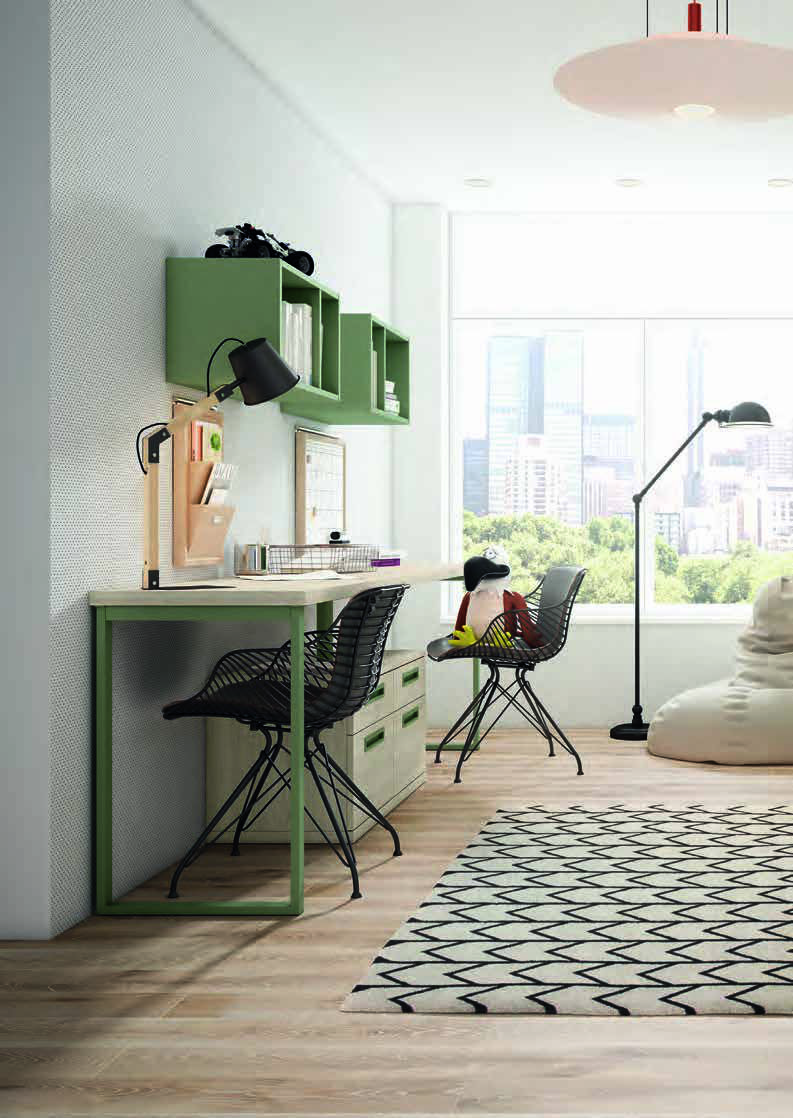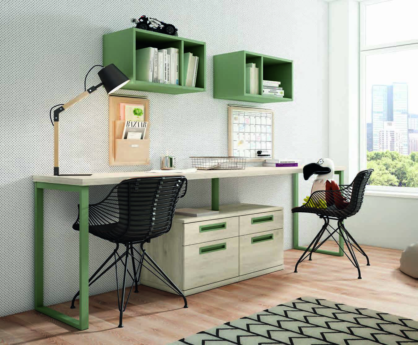 El escritorio doble, con líneas limpias y estructura metálica en color verde, crea un ambiente moderno y práctico, perfecto para estudiar, leer o crear.