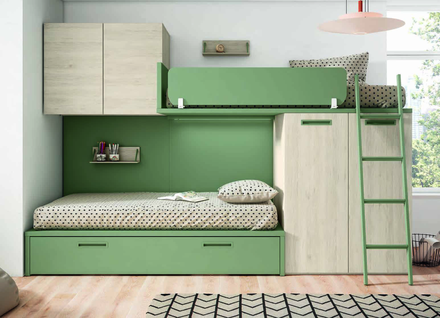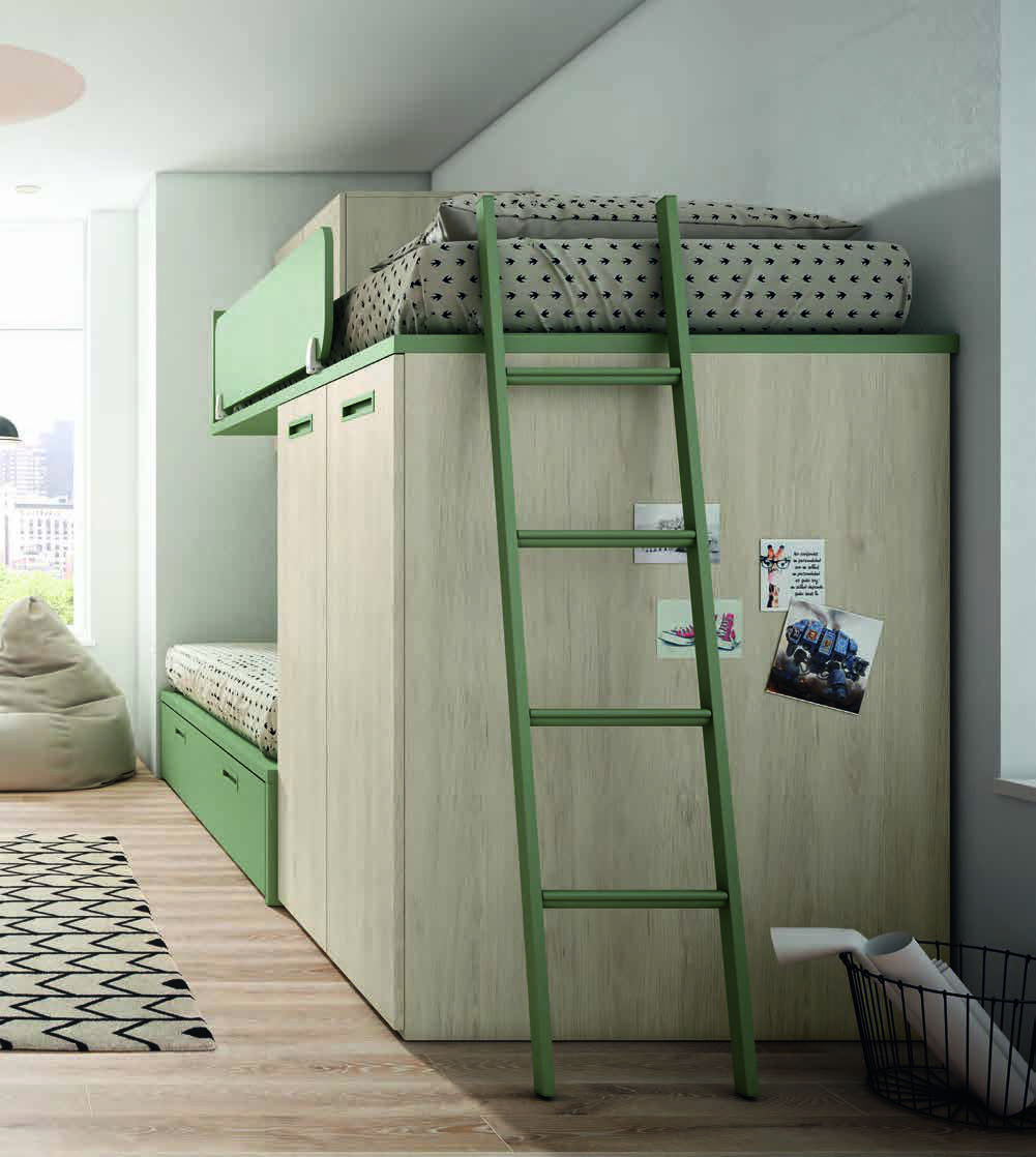 La estructura compacta incluye dos camas —una alta y otra inferior—, amplio espacio de almacenaje y armarios integrados, ideal para habitaciones compartidas o para quienes buscan un espacio versátil y ordenado.