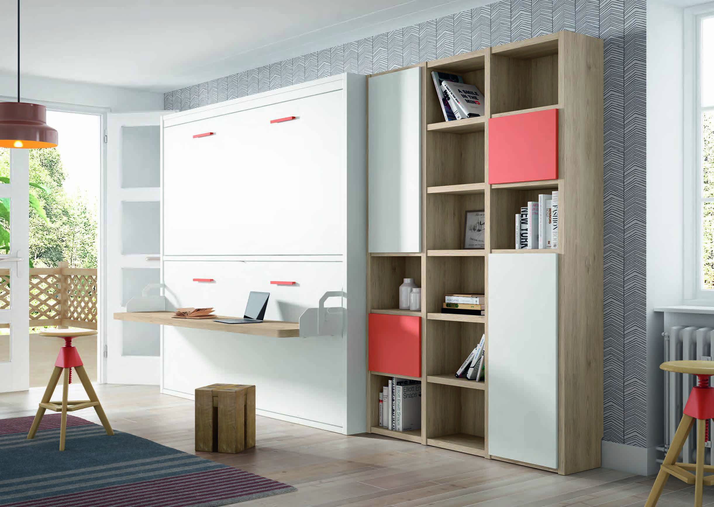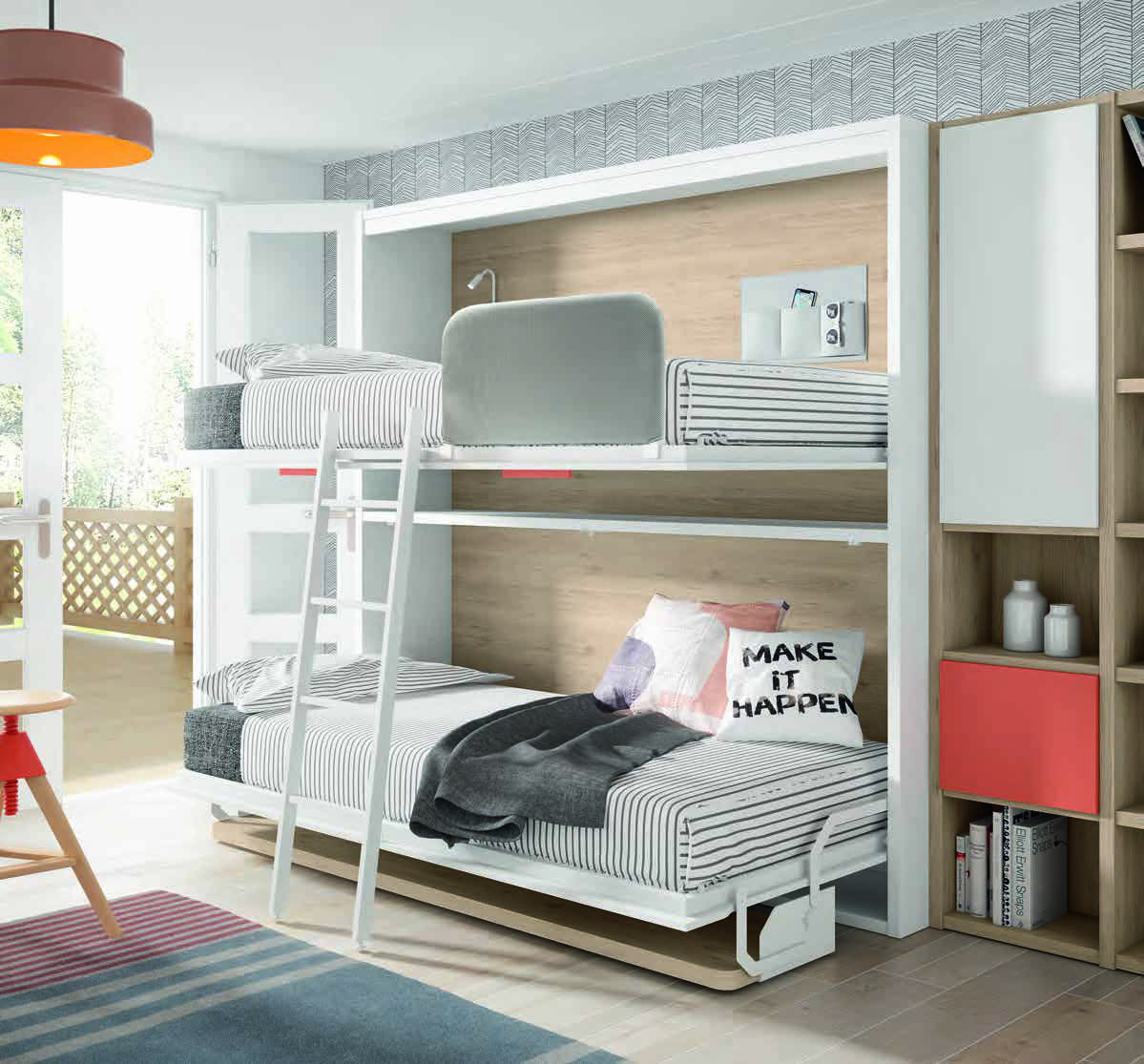 Este dormitorio juvenil con literas abatibles verticales transforma cualquier habitación en un entorno versátil y moderno, ideal para dos personas o invitados.