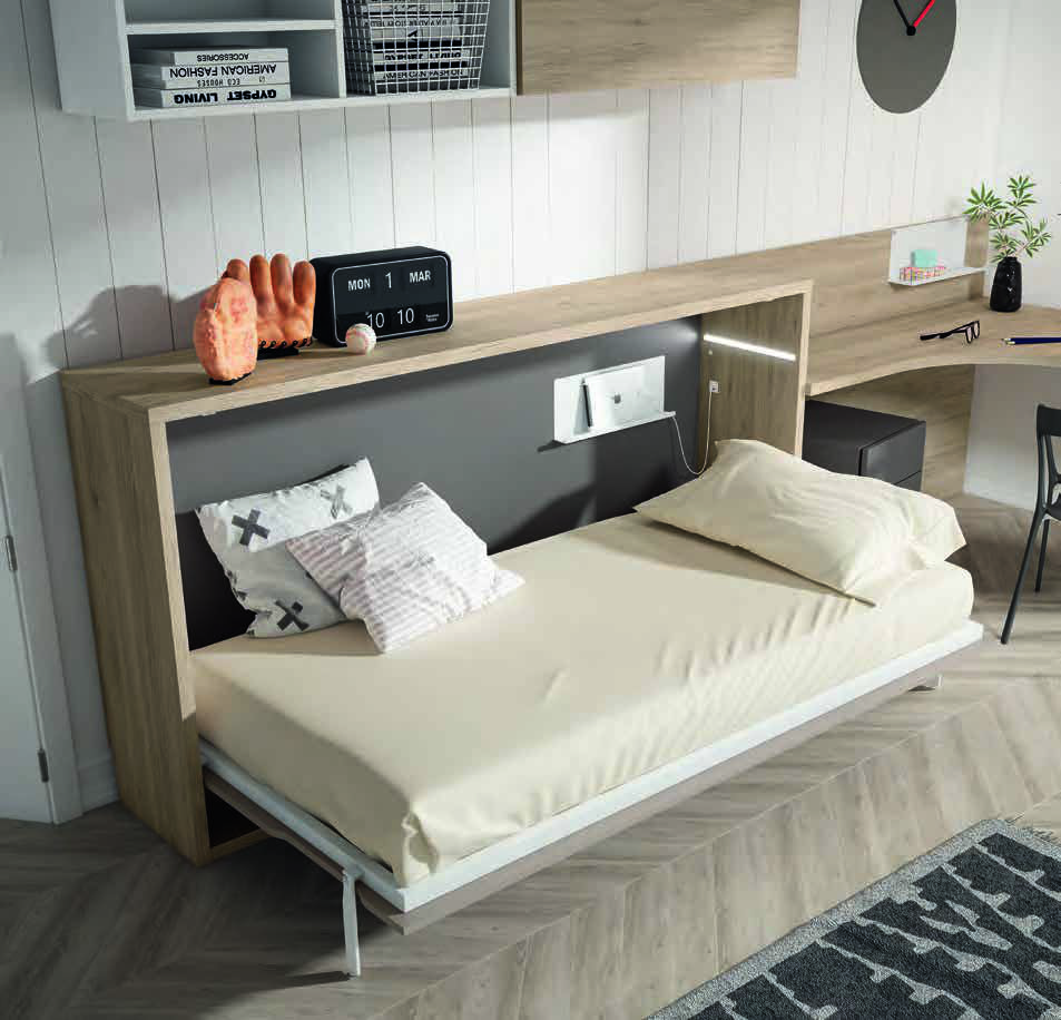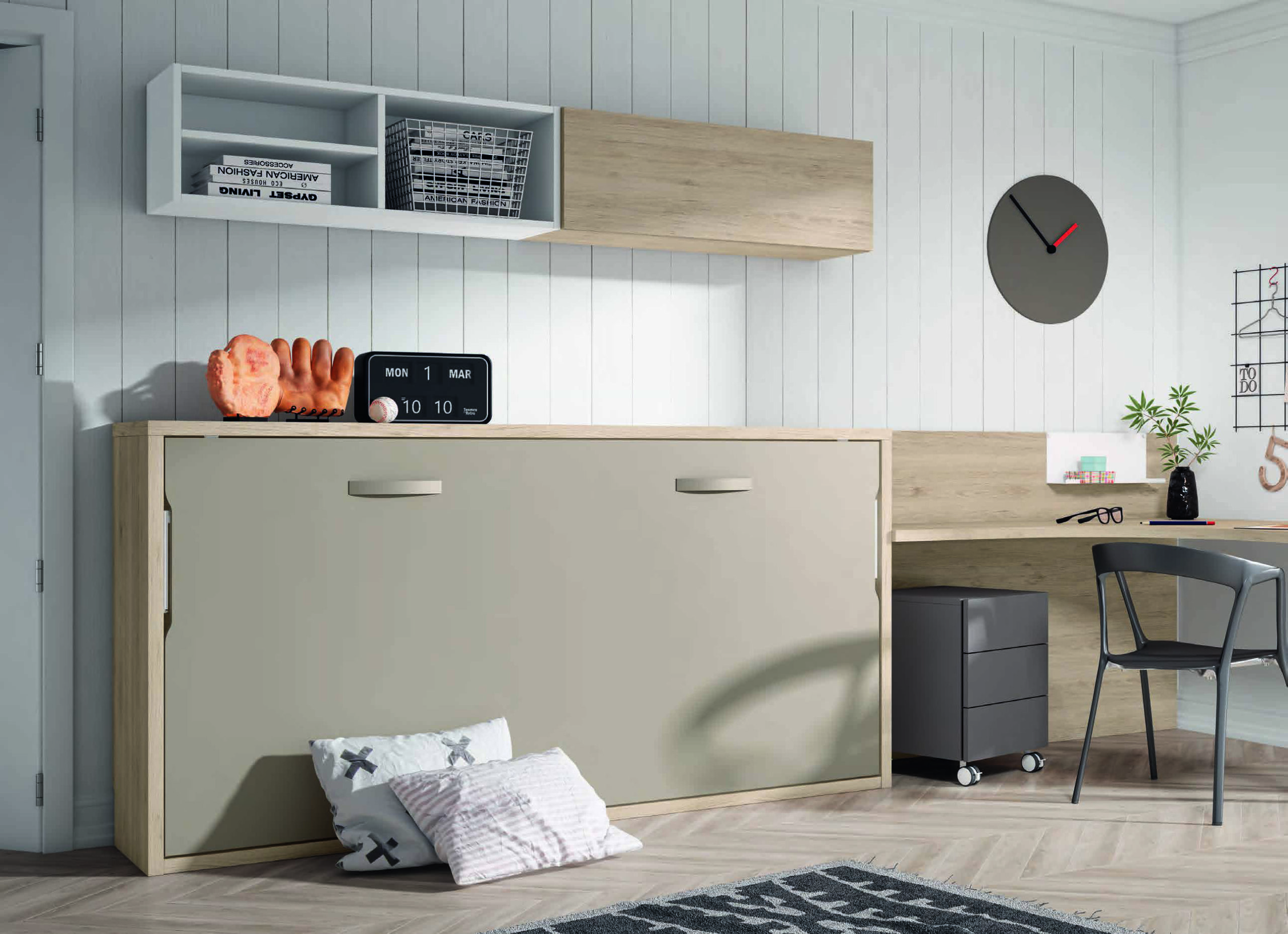Diseñado para aprovechar cada rincón con elegancia, este dormitorio juvenil combina una cama abatible horizontal con zona de estudio integrada, logrando un equilibrio perfecto entre funcionalidad y diseño.