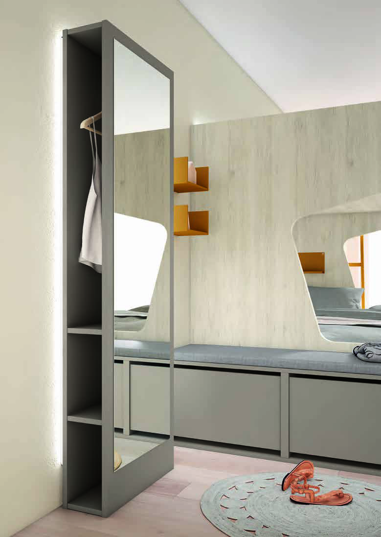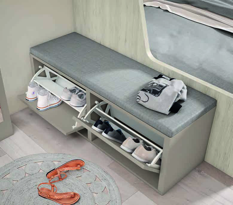 El banco zapatero con asiento tapizado es perfecto para mantener el orden y sentarse cómodamente, mientras que el espejo con luz y estantes laterales multiplica la sensación de amplitud y funcionalidad.