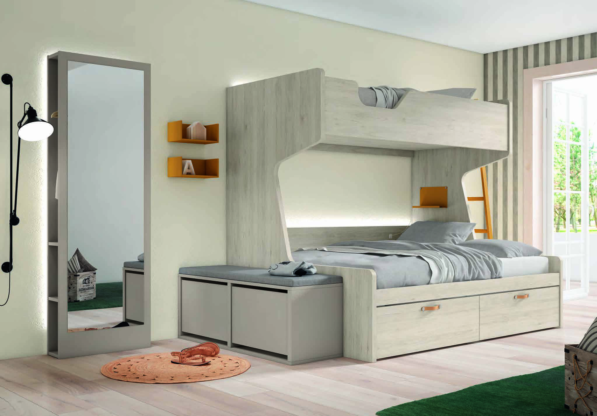 Las literas fijas de líneas suaves crean un ambiente moderno y acogedor, con una estructura sólida y acabados naturales que aportan calidez y estilo.