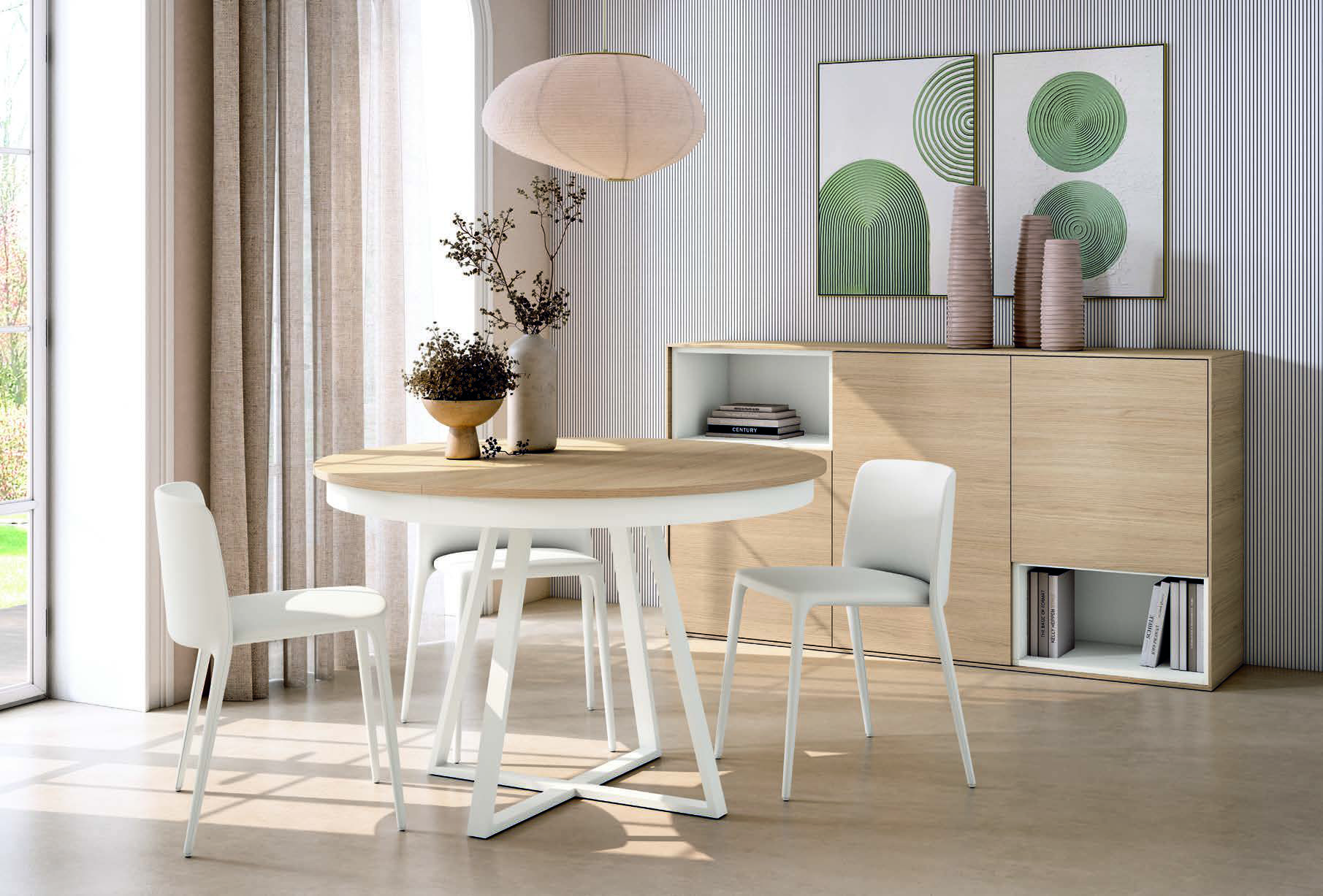 La Mesa MOON extensible de 120 cm en color blanco es sinónimo de luz, estilo y versatilidad. Su diseño redondo aporta armonía al espacio y fomenta la convivencia, mientras que su tono blanco la convierte en una pieza elegante, luminosa y fácil de combinar con cualquier tipo de decoración.